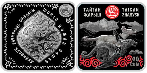 На аверсе монеты воспроизводится реалистическая картинка забега тайганов. (Коллаж собран из нескольких авторских фото, представленных председателем ОО «Клуб Кыргыз Тайганы» Б.А. Мураталиевым). Контур горного хребет Терскей-Ала-Тоо на южном берегу Иссык-Куля и юрты на втором плане создает легко узнаваемый кыргызский пейзаж. Ярко-красная круглая эмблема Игр кочевником над горным хребтом напоминает солнечный диск. По обе стороны от эмблемы надпись на двух языках «Тайган жарыш» / «Taigan Zharysh». Полем для забега тайганов служит национальный растительный орнамент, который по цвету гармонирует с диском эмблемы и отдалённо напоминает характерные только для тайганов колечки на хвосте. В номера участвующих в забеге тайганов 3,1 и 8 заложена информация о дате открытия VI Игр кочевников 31 августа. В правом нижнем углу указан номинал 10 сом.
